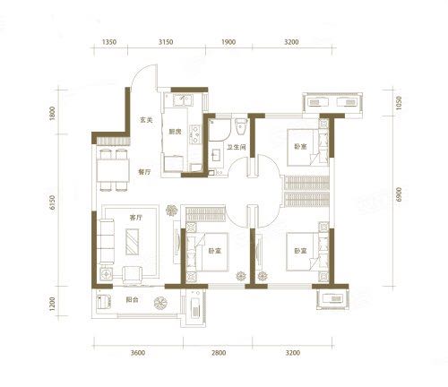 • 户型名称:3室2厅1卫1厨, 97.00平米