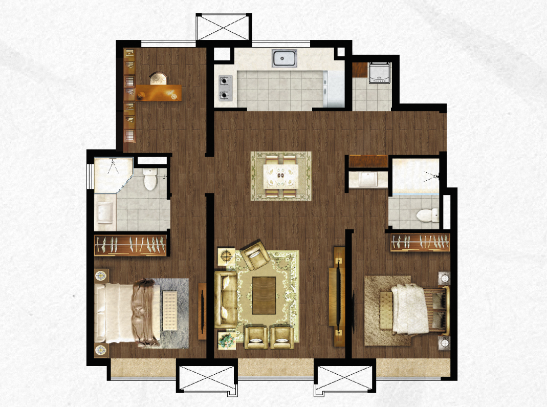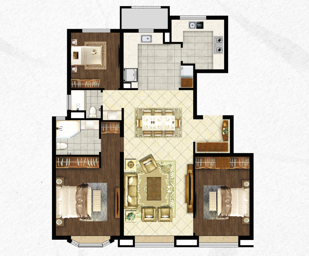 南北通透,全明三室,豁达舒适; 私密玄关,尽显主人尊贵身份; 客厅、餐厅、厨房一字布局,雍容卓显; 客厅及双卧室三面向南,盛纳阳光美景; 主卧套房设计,营造舒适私属空间; 中西双厨,融汇双重烹饪乐趣。